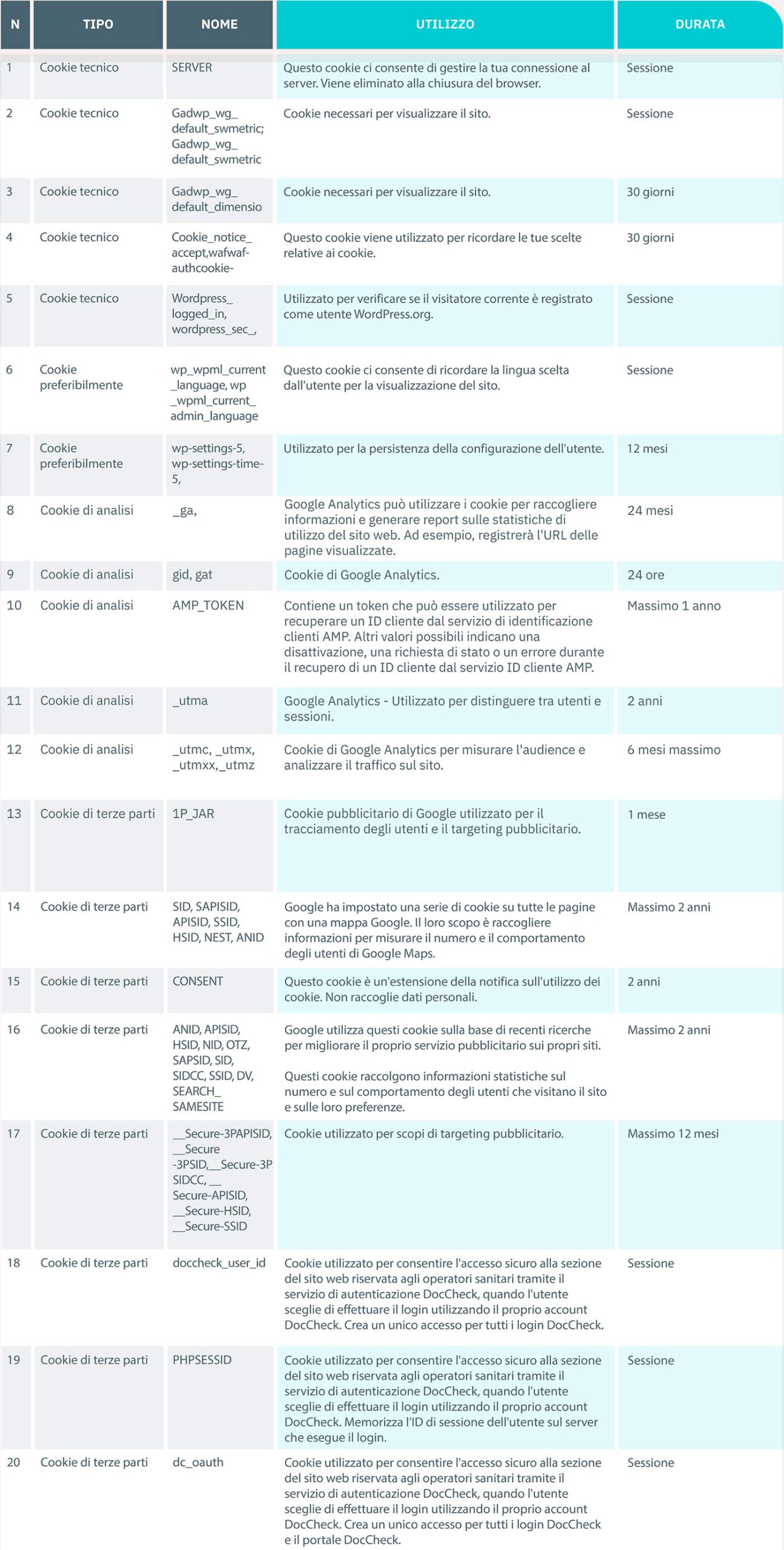 I cookie presenti sul sito web vengono conservati per un periodo di tempo limitato e per i periodi indicati nella tabella sopra riportata, in conformità con le normative vigenti in materia.
